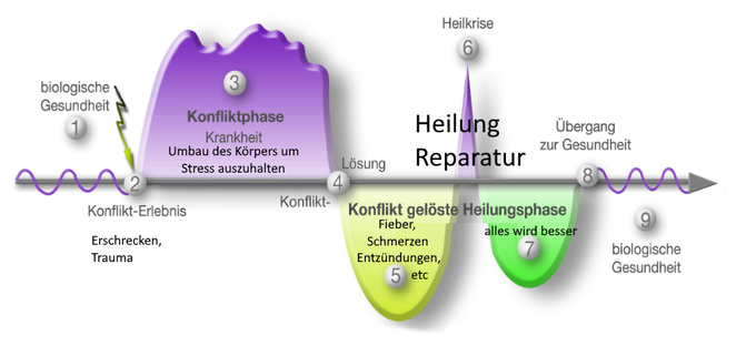 Oberste Priorität hat die Konfliktlösung. Wenn das Problem gelöst ist, wird der Mensch müde und antriebslos (vagoton). Wenn der Körper sich repariert, was die Schulmedizin "Krankheit" nennt, sorgen Schmerzen für eine Ruhigstellung des Körpers, damit er genügend Kraft für einen Umbau hat. Alles wird wieder in den Normalzustand zurückgebaut.