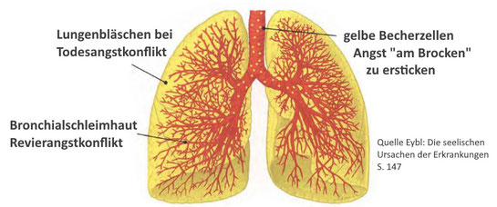 Eine kleine Maus sieht eine Katze. Sie erlebt einen Konfliktschock, fühlt sich allein, isoliert, machtlos und es ist dramatisch. Sie erlebt einen sogenannten „Todesangst- Panik- Konflikt“. Der Organismus der Maus reagiert in diesem Fall u a. mit einer kurzzeitigen Vermehrung der Lungenbläschen. Das hat den biologischen Sinn, dass mit mehr Lungenbläschen die Luft besser verwertet werden kann. Es ist also eine Verbesserung des Gasaustausches, der Körper besser mit Sauerstoff versorgt wird, um leistungsfähiger zu sein und vor Katze schneller weglaufen oder besser kämpfen zu können.